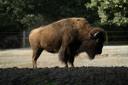 The image shows a large, brown bison walking on a dirt field. The animal has a thick coat of fur and is moving towards the left side of the frame. In the background, there appears to be a fence and some trees. The setting suggests a sunny day with clear visibility.