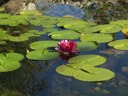 The image displays a serene pond scene filled with lily pads and surrounded by greenery. In the center of the pond, there is a single, fully open water lily with vibrant pink petals that catches attention against the calm water surface.