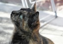 The image shows a tabby cat looking to its left, showing an alert or curious expression on its face. The background is blurred but suggests an outdoor setting with some greenery visible.