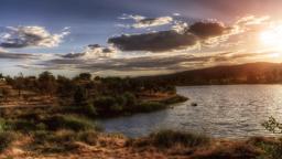 A picturesque sunset over a calm body of water, possibly a lake or pond, with scattered clouds in the sky and light reflection on the surface.