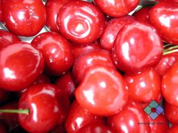 A close-up image of red cherries against a blurred background.