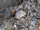 The image shows a small mouse, likely an adult, navigating through a muddy and rocky area, possibly near a water source or after rainfall. The mouse is captured mid-motion, appearing focused on its surroundings. Its fur is dirty, suggesting it has been in this environment for some time.