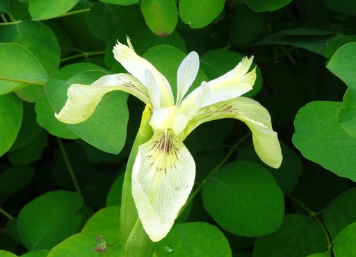 A close-up photograph of an iris flower blooming amidst green foliage, likely taken during the day given the shadows and light.