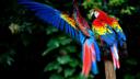 The image shows two vibrantly colored parrots with blue, green, red, and yellow feathers on their wings, tails, and bodies. They are in flight against a dark background which gives the impression of them flying through dense foliage or forest. The birds appear to be in motion, captured mid-flight with dynamic wing flapping and tail fanning.