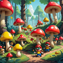 The image is a vibrant, colorful illustration depicting two characters from the Mario series walking along a pathway in a forest filled with mushrooms.