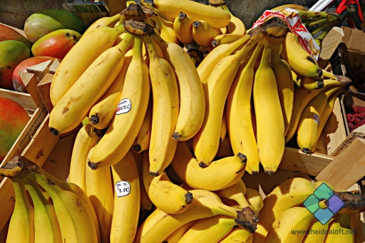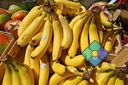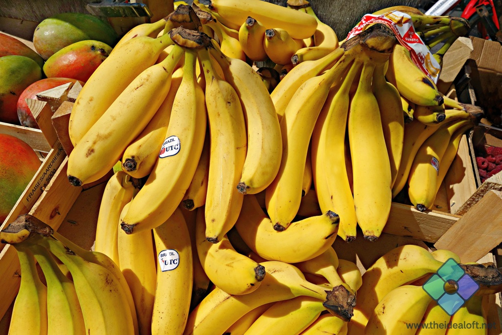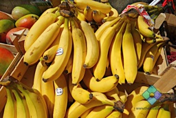 This image shows a large quantity of ripe yellow bananas in cardboard boxes, indicating that they may be for sale at a fruit market or grocery store. The background is somewhat blurred, but there appears to be another type of fruit nearby.
