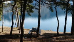 A tranquil scene at a lakeside picnic area featuring a wooden bench and trees reflected on the water's surface under a clear sky.