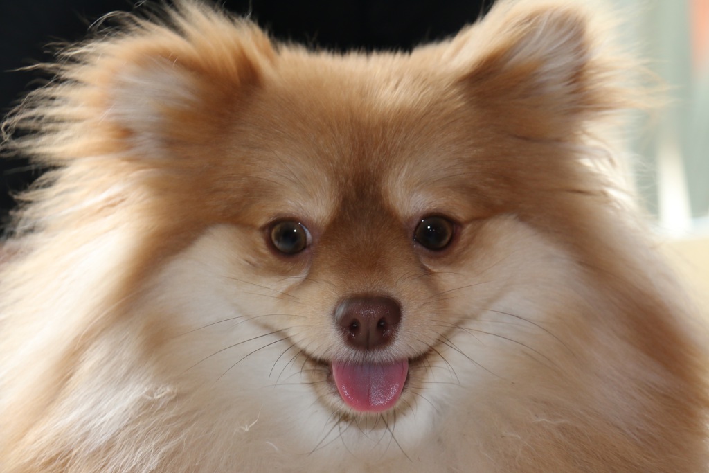 An adorable pink dog with a fluffy coat and bright eyes looking at the camera.