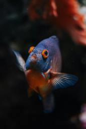 An image of a clownfish swimming underwater. The fish has orange and black stripes with a blue head and white tips to its fins.