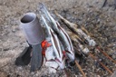 The image shows a charcoal grill on which fish, specifically what appears to be sardines or similar small fish, have been skewered and cooked over the fire. The grill is placed outdoors, with dark sand around it, and there are no visible human figures in the scene. The fish are arranged in two rows, one of which is partially obscured by the other. There's an oven-like structure that appears to be part of the grilling setup to the right side of the fish.