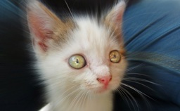 The image shows a kitten with green eyes staring directly at the camera. The kitten has white fur with dark patches on its face, ears, and body.