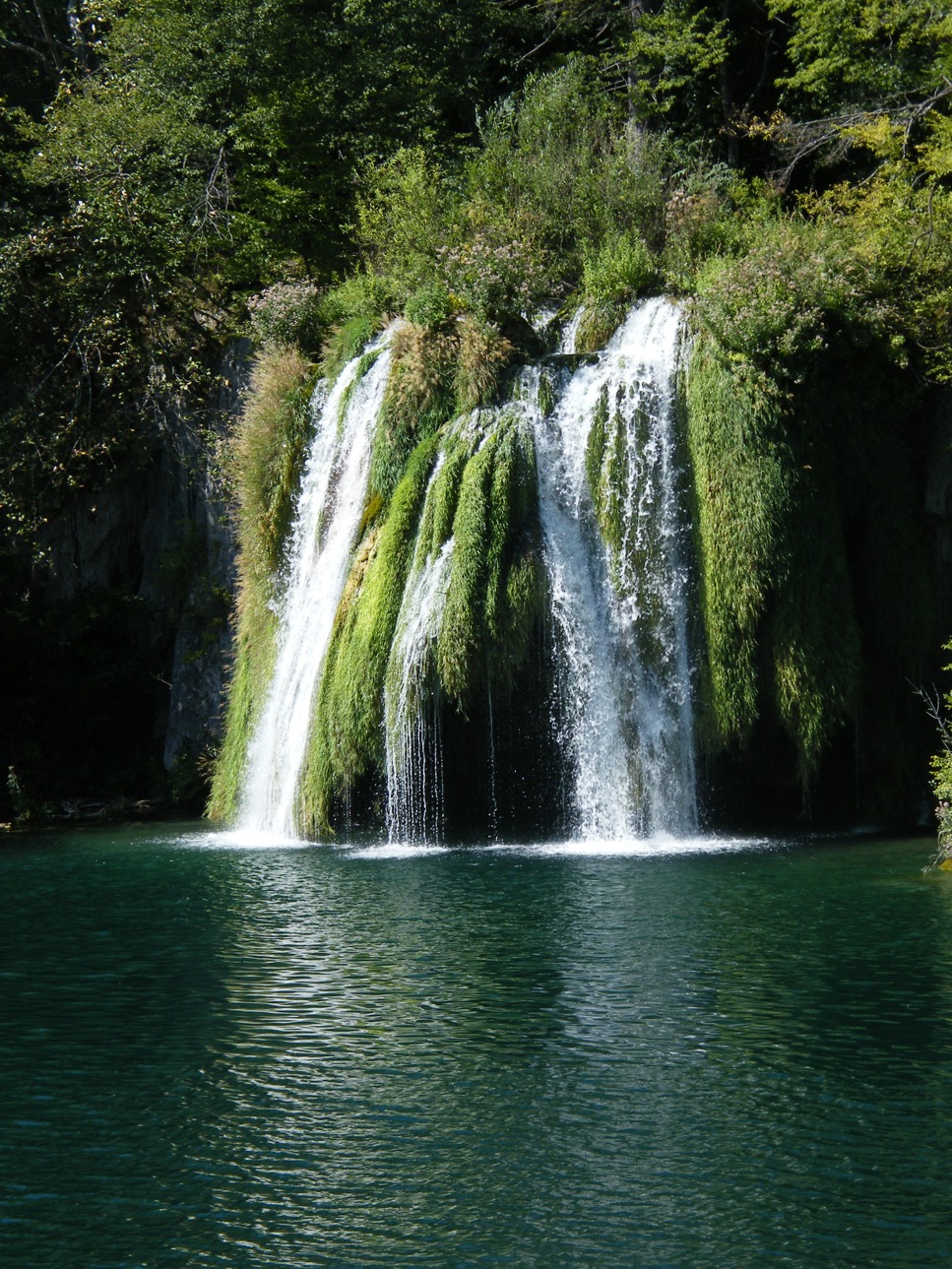 This is a serene image of a waterfall cascading over a cliff into a still lake, surrounded by lush green trees and rocks.