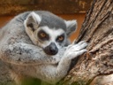 This image features a gray and white lemur perched on a tree trunk. The lemur has its arms wrapped around the branch, gripping it tightly with both hands as if trying to maintain balance or protect itself.