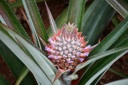 The image shows a close-up of a crown of thorns plant, which is known for its striking red flowers and spiky leaves. The flower in focus is purple and white with red tips, and the surrounding plants exhibit varying shades of green with some yellowing due to age or environmental factors. The overall tone of the image is naturalistic, capturing the beauty and texture of this tropical plant in its natural habitat.