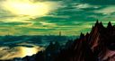 The image depicts a fantastical landscape under a vibrant, greenish sky with yellow and orange hues, indicative of either sunrise or sunset. In the foreground, there are sharp, jagged peaks that could be considered mountains or an island's rock formations. The middle ground features a calm body of water reflecting the sky's colors. On the horizon, one can see silhouettes that might suggest buildings or other structures, hinting at the presence of civilization in this fantasy world. The overall atmosphere is serene and majestic, suggesting a scene from a video game or a fantastical realm.