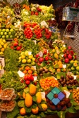 This image depicts a colorful display of fruits and vegetables arranged for sale in a market setting. The produce is fresh, with a variety of shapes, sizes, and colors that suggest a range of flavors and nutritional benefits. This photo conveys the vibrancy and abundance typically associated with a lively marketplace scene.