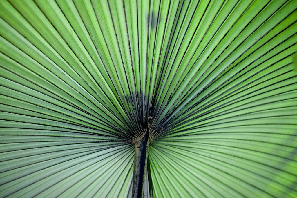 Close up of green palm fronds, showcasing their unique circular pattern and stalk at the center.