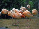 The image shows a group of flamingos gathered in what appears to be a controlled environment, possibly a sanctuary or reserve. The birds are standing on one leg, with some looking at the camera and others facing away from it. Their feathers are vibrant pink with a hint of orange, which is typical for these species. There are green plants in the background, suggesting a natural setting. The image does not depict any explicit content or themes that would make it unsafe for all audiences.
