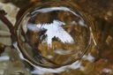 A close up of water droplets on a leaf, capturing the lens effect and the surrounding nature scene.