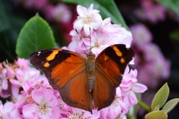 The image shows a vibrant orange and black butterfly perched on top of pink flowers with green leaves. The butterfly has wings that are spread out, showing the characteristic markings of its species.