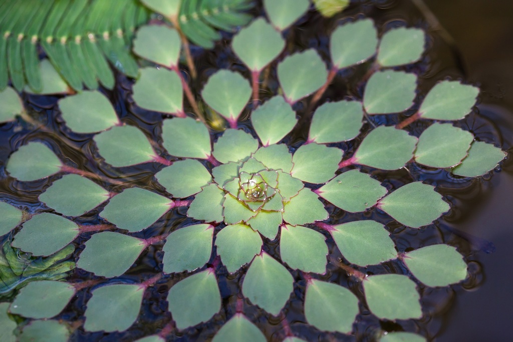 The image shows a close-up view of a lily pad in shallow water, surrounded by other aquatic plants that have broad green leaves with a few pink and white details.