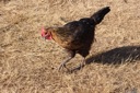 This is an image of a chicken standing on dry grass in what appears to be a natural outdoor setting, possibly during the day based on the lighting.