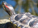 The image shows a red-eyed turtle with black and yellow markings on its shell, resting on a rock in what appears to be a pond or lake environment.