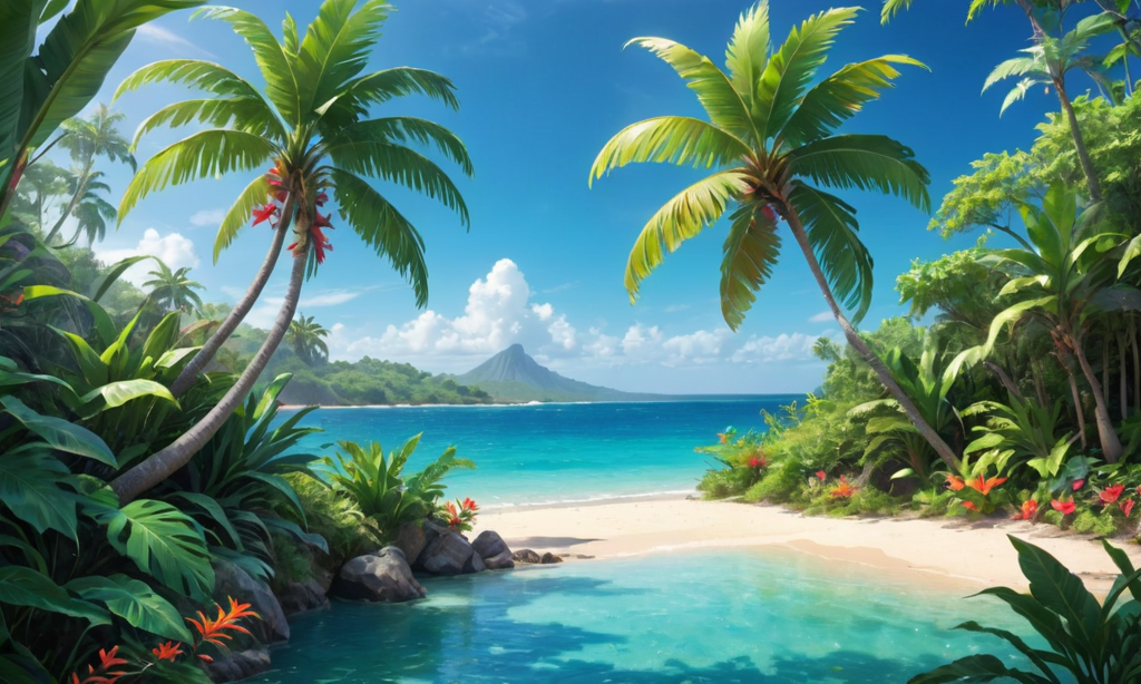 This image depicts an idyllic tropical beach scene. A clear blue sky stretches above the land, and there is a large volcanic mountain in the distance. The foreground features palm trees that appear lush and green, with red flowers blooming from their fronds, adding a vibrant splash of color to the scene. The water is a deep turquoise shade, suggesting a clean and healthy ocean environment. There are no visible people in the image, which adds to its serene and untouched atmosphere.