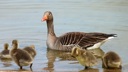 A mother duck and her ducklings in the water, enjoying a swim together.