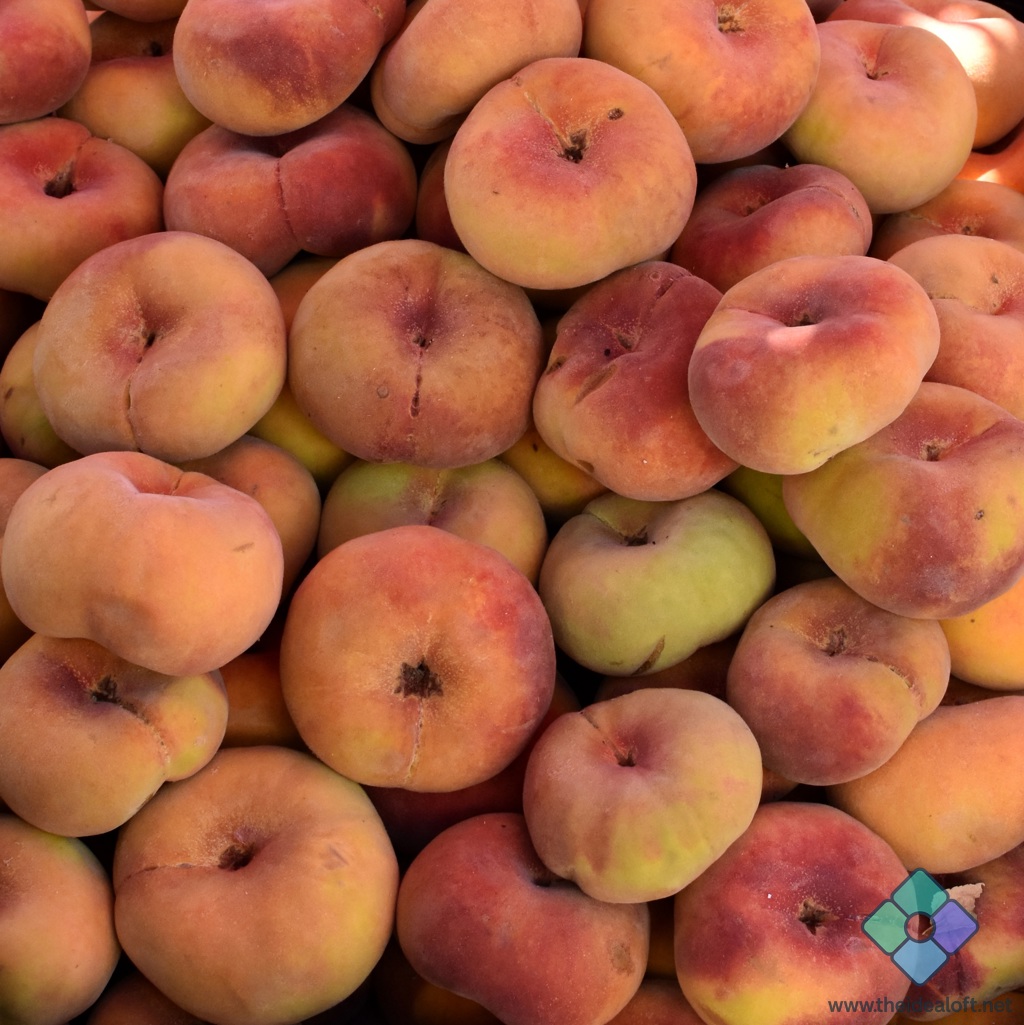 The image shows a large pile of red and yellow peaches stacked on top of each other, possibly for display or sale purposes.