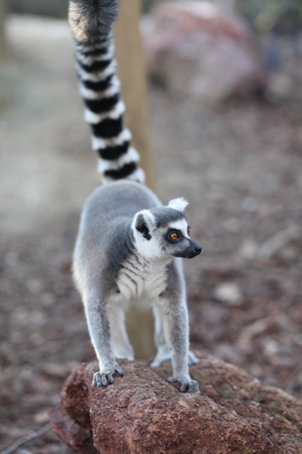 A young lemur is standing on a rock in an outdoor enclosure, looking alert and possibly curious about something off-camera.