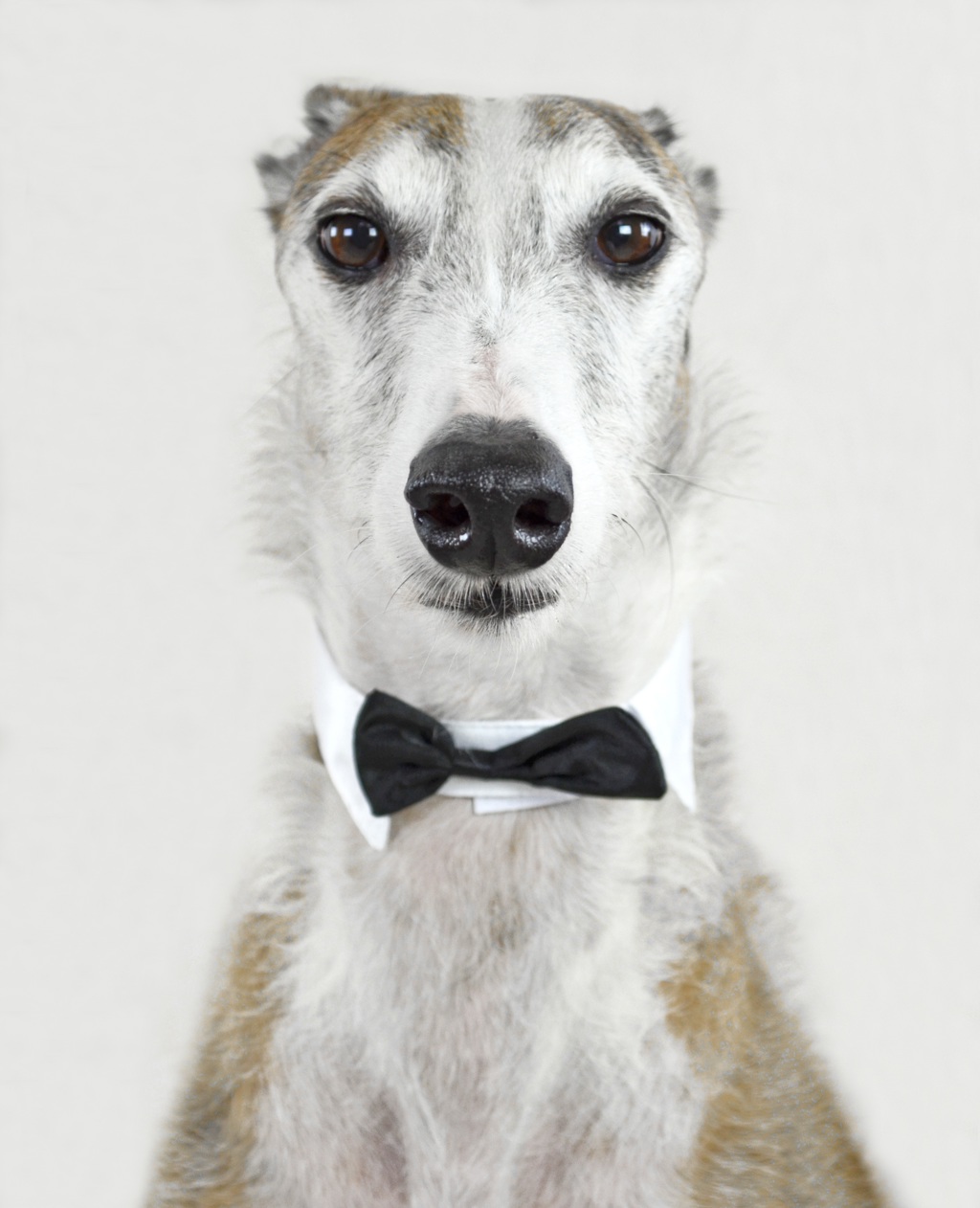 The image shows a dog wearing a black bow tie and a bandana around its neck, posed for the photo against a plain background. The dog has pointy ears characteristic of breeds like greyhounds or Italian greyhounds.