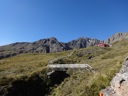The image is of a natural landscape with mountainous terrain, and in the foreground there is a small bridge or footpath with wooden railing. The sky is clear and blue, suggesting a sunny day. There are no people visible in the image.