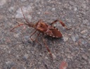 The image depicts a close-up view of a red bug, possibly a beetle or an insect with a shiny body and long antennae, resting on what appears to be a textured surface such as pavement. The bug has six legs, two wings, and is facing downwards with its underside exposed.