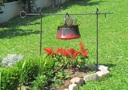 The image shows a garden setting featuring a black iron stand holding a metal bell with flames painted on it. Below the bell, there is a plant pot containing what appears to be a small green shrub. To the right of the stand, there are red flowers blooming in a flower bed with grass and rocks around. The sky is clear, suggesting it might be daytime.