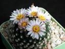 The image shows a single cactus plant in a pot filled with sand or gravel, commonly used for succulent plants. The cactus has several small flowers blooming at the top, which are typical characteristics of cacti. The flowers have petals in shades of yellow and white.
