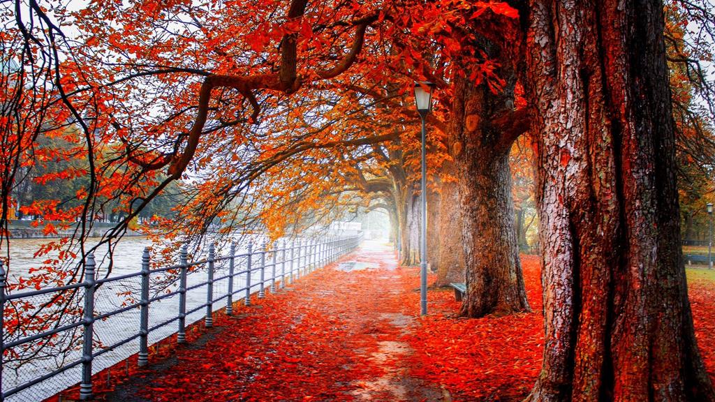 The image captures a serene autumn scene, featuring a pathway lined with trees whose leaves have turned a vibrant red. The sky is overcast, casting a soft light on the scene. A gate can be seen in the distance, partially obscured by the fall foliage.