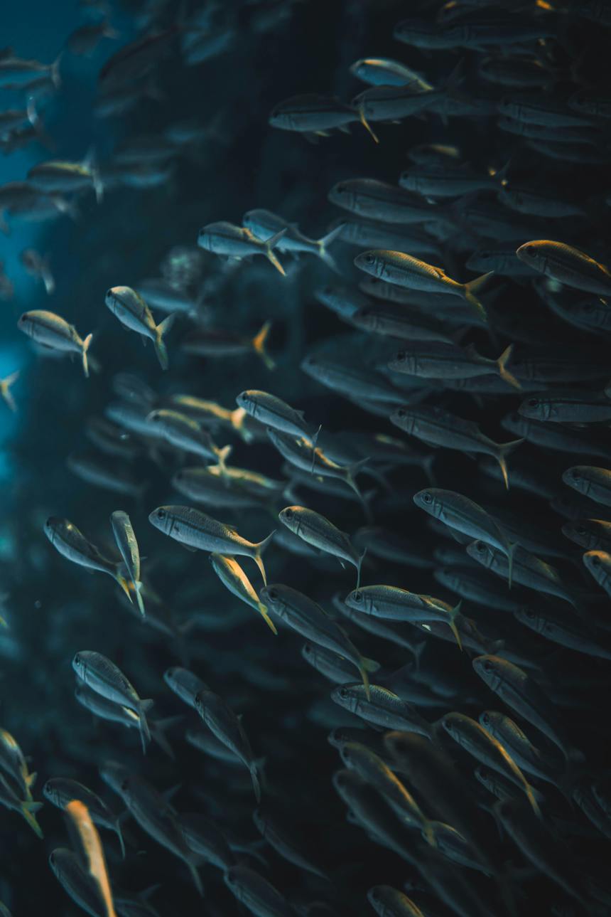 The image captures a vibrant scene underwater, featuring a large group of small fish known as sardines. The fish are densely packed together, their bodies shimmering with colors that range from yellow to silver and gold hues. They appear to be swimming in unison, creating an impressive spectacle against the deep blue backdrop of the ocean floor.