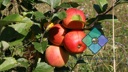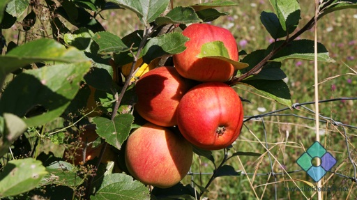 The image is a close-up photograph of an apple tree with ripe apples hanging from the branches.