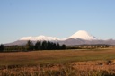 The image shows a serene landscape under a clear sky, with rolling hills leading up to a majestic snow-capped mountain in the distance. The vegetation appears sparse and there is no visible human activity. The overall impression is one of tranquility and natural beauty.