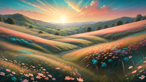 A vibrant landscape painting depicting a sunrise over rolling hills and fields of wildflowers. The sun is low in the sky, casting a warm glow on the scene. The colors are predominantly green, pink, and blue with some yellow and purple accents. The style of the artwork is impressionistic, giving it an almost dreamlike quality.