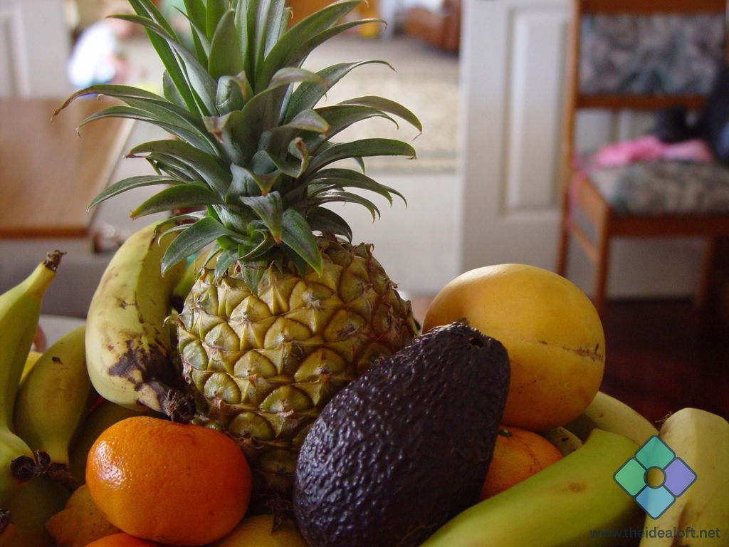 A bowl of fruit on a table, including bananas, oranges, pineapple, and avocados.