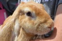 A photo of a person holding a light brown rabbit close to them, showcasing the pet's cute features against a blurred outdoor background.