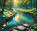 A serene landscape scene featuring a small river winding through mossy rocks and trees, bathed in warm sunlight.