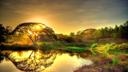 A serene natural landscape at sunrise, featuring a river and trees reflecting the sun's glow in its still water, with no people or animals visible.