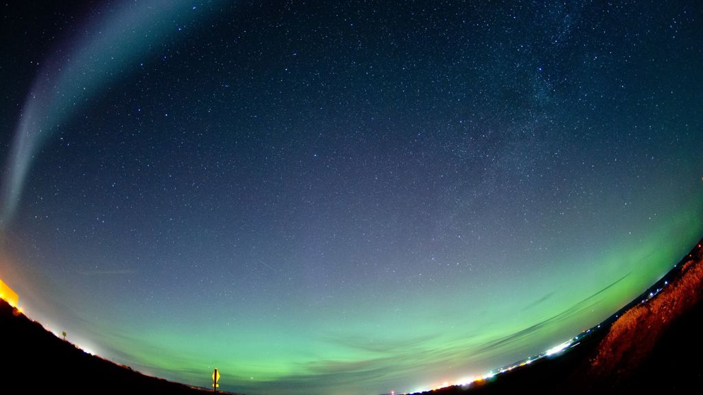 The image shows an aurora borealis illuminating the night sky, featuring bright greens and yellows typical of such natural light displays. The horizon is visible in the lower part of the photo with hints of landscape or man-made structures.