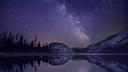 A nighttime scene showcasing a starry sky above a calm, dark lake bordered by dense forested areas under the light of a crescent moon.