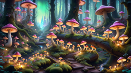 A dark forest filled with light brown mushrooms and pink ones, some of which are glowing. A staircase can be seen in the distance, leading to a castle-like structure. The scene has an eerie atmosphere due to the blue sky.