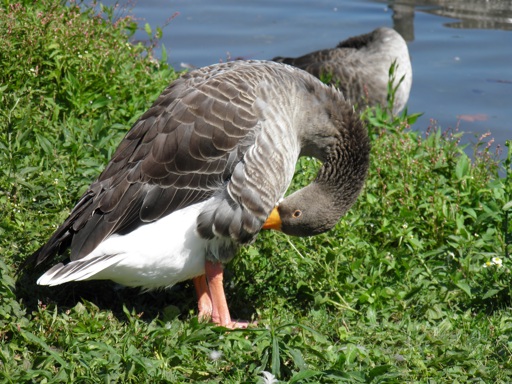 A brown duck standing on the grass near a body of water, possibly cleaning itself or looking for food.