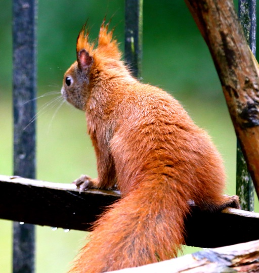 An adult squirrel perched on a wooden bench, looking to its left, possibly searching for food or observing its surroundings.